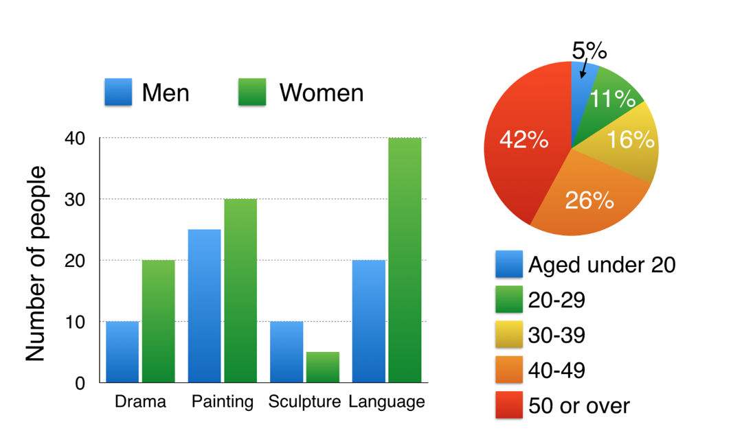 The first bar chart shows the preferred courses of men and women who participated in different evening classes at an education for grown-up people, and the second chart illustrates the percentage of type of participants' ages from under 20 to over 50.