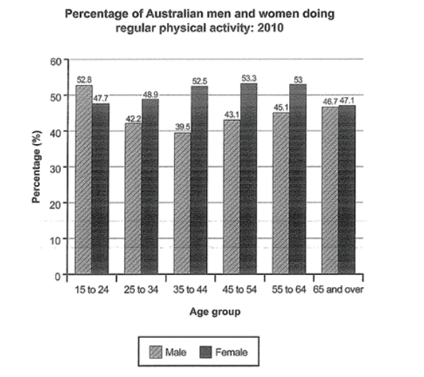 The bar chart shows the percentage of Australian men and women in different age group who did regular physical activity in 2010.