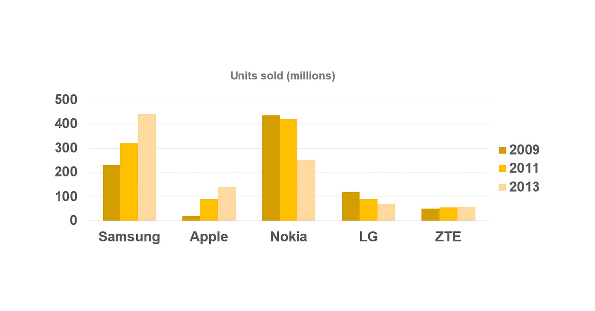 The bar chart compares the revenues of five mobile phone brands throughout 2009, 2011 and 2013.