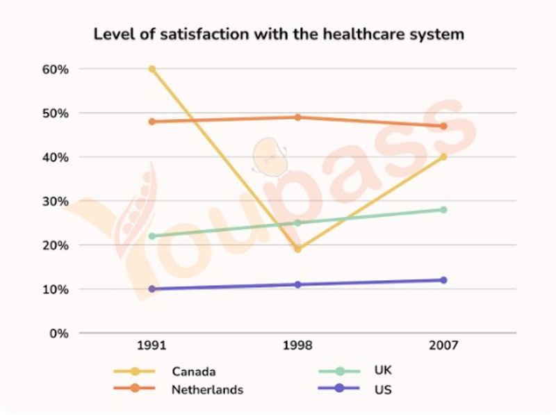 The graph depicts the satisfaction level in the healthcare system in four different nations from 1991 to 2007. Overall, satisfaction levels in the UK and the US rose gradually, whereas Canada experienced a sharp fluctuation, and the Netherlands remained relatively stable. The most dramatic change was in Canada, where the figure dropped significantly before rising again.