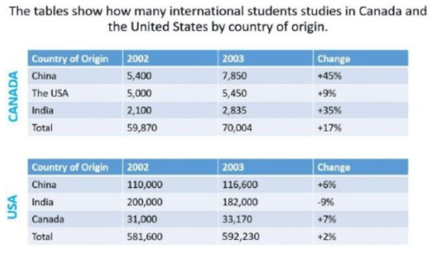 In 2002, Canada welcomed 5,400 Chinese students, which increased by 45% in 2003 and it was 39% higher than the number of students in USA from the starting year of 110,000 to 116,600 oven a period of one year. The figure of Indian learners was gradually in 2003, which rose by 2,835 in Canada, and the growth of Indian learners had 35% from last year, while the proportion of Indian learners dropped from 200,000 to 182,000, it means slightly by 9% of a year.